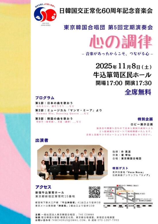 東京韓国合唱団 第五回定期演奏会 ゲスト演奏にて伴奏者として出演します 公開日 : 2025年11月3日 レッスンブログ 海老名市大谷のピアノ教室石田音楽教室です。 こちらの演奏会に、ゲスト演奏にて伴奏者として出演いたします♩ 興味のある方いらっしゃいましたらお問い合わせください🤲 関連記事 音楽を好きで居続ける為に 9月のレッスン日程 1月19日に綾瀬市オーエンス文化会館にて演奏会を行いました 4月29日(金) ピアノ教室Andanteの発表会のゲスト演奏として出演させていただきます 10月のレッスン日程 「11月のレッスン日程」
